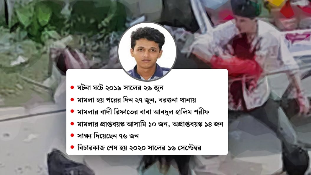 ওই ভিডিওতে দেখা যায়, গত বছরের ২৬ জুন রিফাত শরীফ সকাল পৌনে ১০টার দিকে একটি মোটরসাইকেলে করে বরগুনা সরকারি কলেজের গেটের সামনে আসেন। এরপর তিনি কলেজের ভেতর প্রবেশ করেন। ভেতরে প্রবেশের কিছু সময় পর ঘটনাস্থলে আসেন এ হত্যা মামলার ২ নম্বর আসামি রিফাত ফরাজী। আরও দুই থেকে তিন মিনিট পর তাঁর দু–তিনজন সঙ্গী কলেজে ঢোকেন। রিফাত শরীফ ও তাঁর স্ত্রী আয়শা সিদ্দিকা ওরফে মিন্নি কলেজ থেকে বের হন। কিন্তু কলেজগেটে রিফাত ফরাজীর সঙ্গে দলবল দূর থেকে দেখে স্বামীকে টেনে আবার কলেজে ঢোকানোর চেষ্টা করেন আয়শা, কিন্তু পারেননি। টেনেহিঁচড়ে রিফাতকে বের করে এনেই প্রথমে কিলঘুষি শুরু করেন তাঁরা। এরপর কলেজের পূর্ব দিকে অপেক্ষমাণ নয়ন বন্ডের কাছে নিয়ে যাওয়া হয় রিফাত শরীফকে। আয়শাও পেছনে পেছনে যান। নয়ন বন্ডের কাছে রিফাত শরীফকে নিয়ে যাওয়ার পর ১০-১২ জন তাঁকে ঘিরে ধরে পেটাতে শুরু করেন। এ সময় রিফাত ফরাজী ও তাঁর অপর এক সহযোগী দৌড়ে কাছাকাছি কোথাও লুকিয়ে রাখা দুটি রামদা নিয়ে আসেন। এর একটি রামদা নয়নের হাতে দেন রিফাত ফরাজী। পরে রিফাত ও নয়ন বন্ড দুজনে মিলে এলোপাতাড়ি কোপাতে থাকেন রিফাত শরীফকে। আর তাঁদের হাত থেকে স্বামীকে বাঁচাতে চেষ্টা করেন স্ত্রী আয়শা। রিফাত শরীফকে কুপিয়ে গুরুতর জখম করার পর রিফাত ফরাজী ও নয়ন বন্ড রামদা হাতে সবার সামনে দিয়ে সঙ্গীদের নিয়ে ঘটনাস্থলের পশ্চিম দিকে চলে যান। তখন রিফাত শরীফের ক্ষতবিক্ষত শরীর থেকে ব্যাপক রক্তক্ষরণ হচ্ছিল। পরে বেলা তিনটার দিকে বরিশালের শের–ই–বাংলা মেডিকেল কলেজ হাসপাতালে চিকিৎসাধীন অবস্থায় তিনি মারা যান।