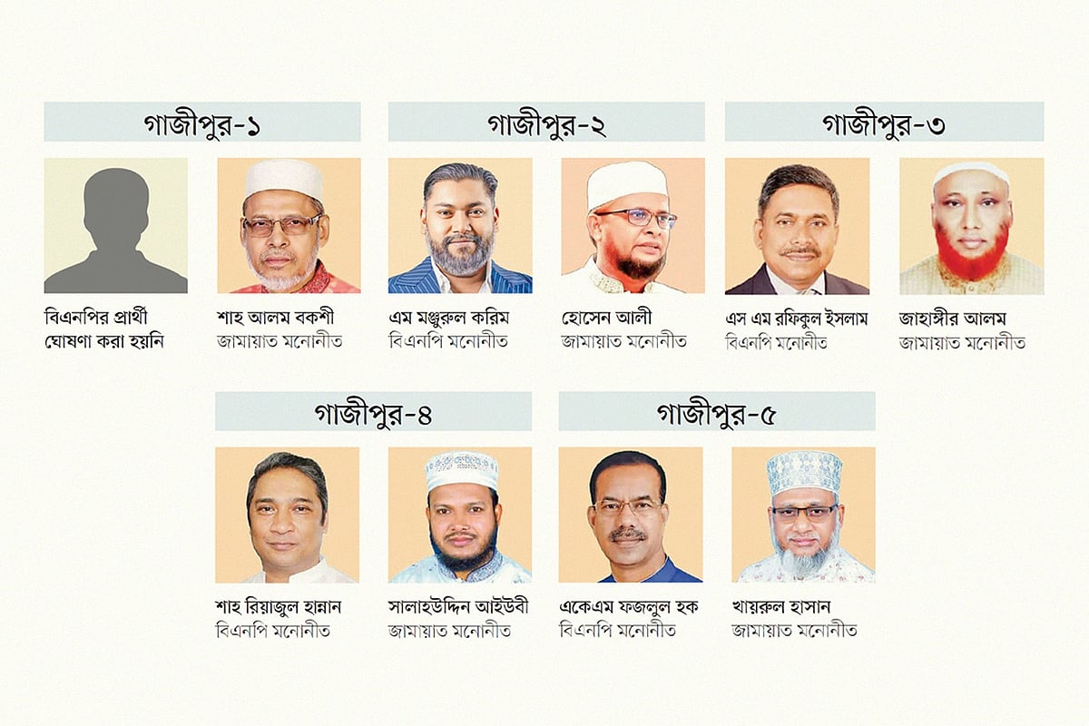 শাহ রিয়াজুল হান্নান প্রথম আলোকে বলেন, ‘গাজীপুর চারটি আসনে প্রার্থী ঘোষণা করা হয়েছে। বাকি আছে শুধু গাজীপুর-১। শুরুতে প্রতিটি আসনেই অনেক প্রার্থী ছিল; তবে কেন্দ্রীয়ভাবে প্রার্থী ঘোষণার পর প্রচারের কাজ শুরু করেছি।’
