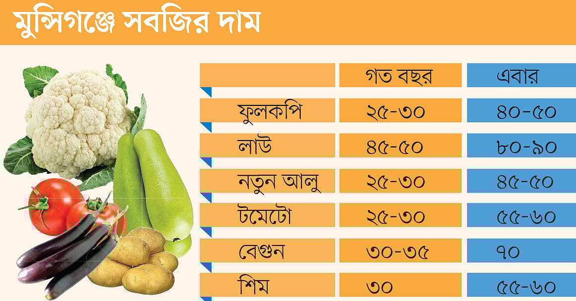 মুন্সিগঞ্জ জেলা কৃষি সম্প্রসারণ অধিদপ্তরের উপপরিচালক আবদুল আজিজ প্রথম আলোকে বলেন, এবার মৌসুমের শুরুতে দুই বার ভারী বৃষ্টির জন্য ফসলের সামান্য ক্ষতি হয়েছে। সবজি আবাদেও কিছুটা বিলম্ব হয়েছে। তবে গতবার এ সময়ে সবজির যেমন উৎপাদন ছিল, এ বছরও তেমনই রয়েছে। মাঠে-বাজারে কোথাও সবজির ঘাটতি নেই। এরপরও গতবারের তুলনায় দাম অনেক বেশি। বিষয়টি যাঁরা বাজার দেখাশোনা করেন, তাঁরাই ভালো বলতে পারবেন।