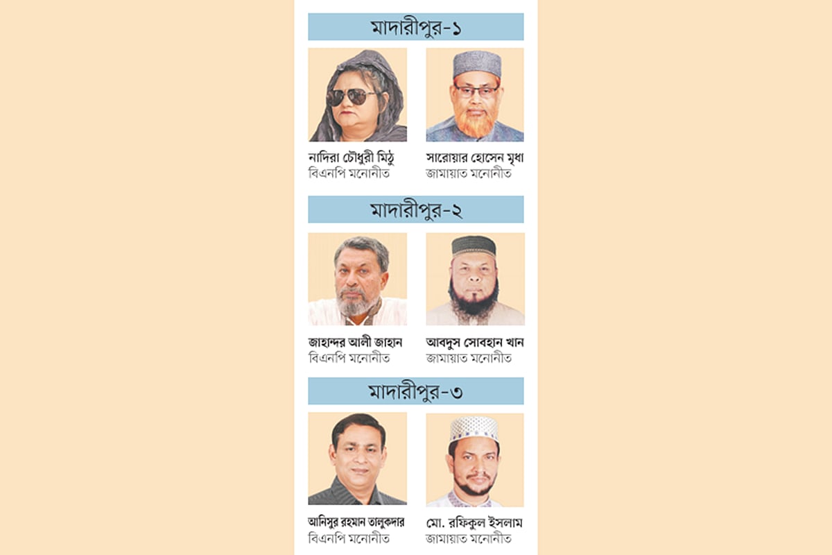 মাদারীপুরের ভোটের রাজনীতিতে দীর্ঘদিন আওয়ামী লীগের আধিপত্য ছিল। কার্যক্রম নিষিদ্ধ দলটি মাঠে না থাকায় নতুন সমীকরণ তৈরি হয়েছে। ইতিমধ্যে তিনটি আসনে প্রার্থী ঘোষণা করে নিজেদের অবস্থান জানান দিয়েছে বিএনপি ও জামায়াতে ইসলামী। নতুন দল জাতীয় নাগরিক পার্টি (এনসিপি) এখনো কোনো আসনে প্রার্থী ঘোষণা করেনি। তবে তিনটি আসনেই তৎপর দলের মনোনয়নপ্রত্যাশী তিন নেতা।