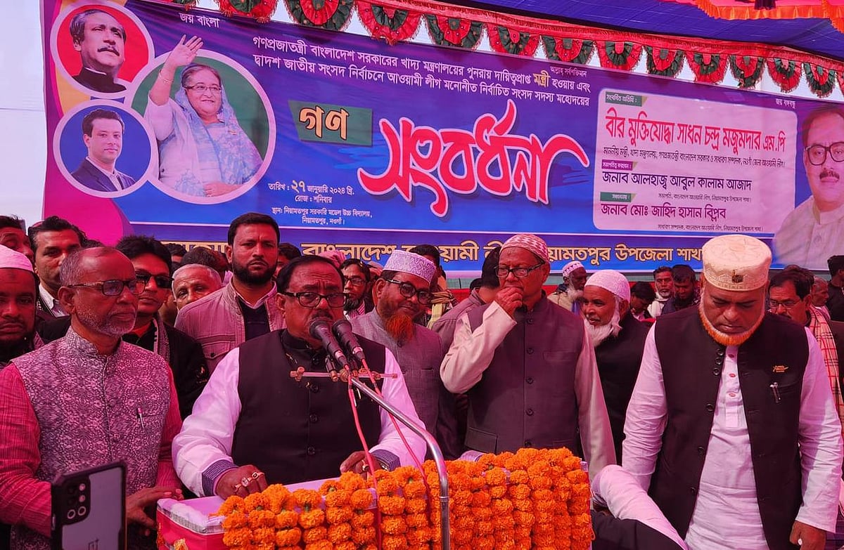 আজ শনিবার দুপুরে নিয়ামতপুর উচ্চবিদ্যালয় প্রাঙ্গণে এক সংবর্ধনা অনুষ্ঠানে খাদ্যমন্ত্রী এসব কথা বলেন। চতুর্থবারের মতো সংসদ সদস্য নির্বাচিত হওয়া এবং দ্বিতীয়বারের মতো সাধন চন্দ্র মজুমদার খাদ্যমন্ত্রীর দায়িত্ব পাওয়ায় নিয়ামতপুর উপজেলা আওয়ামী লীগ এ সংবর্ধনা অনুষ্ঠানের আয়োজন করে।