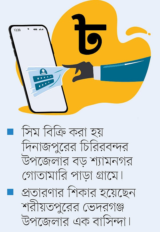 বলতে থাকেন বিনা মূল্যে সিম নেওয়ার কথা। সবার সিম নেওয়ার তারিখ ২০২২ সালের ১১ আগস্ট। গ্রামবাসী জানান, ওই দিন তাঁদের গ্রামে তিন যুবক এসে এক শিক্ষিকার বাড়িতে ছাতা-চেয়ার-টেবিল পেতে বসে। সেখানে একটি মুঠোফোন কোম্পানির সিম বিনা মূল্যে দিচ্ছিলেন তাঁরা। সঙ্গে ইন্টারনেট ও টকটাইমের কথা বলা হয়। ওই যুবকেরা সবার আঙুলের ছাপ, চোখের মণির ছবি ও জাতীয় পরিচয়পত্র নিয়েছে।