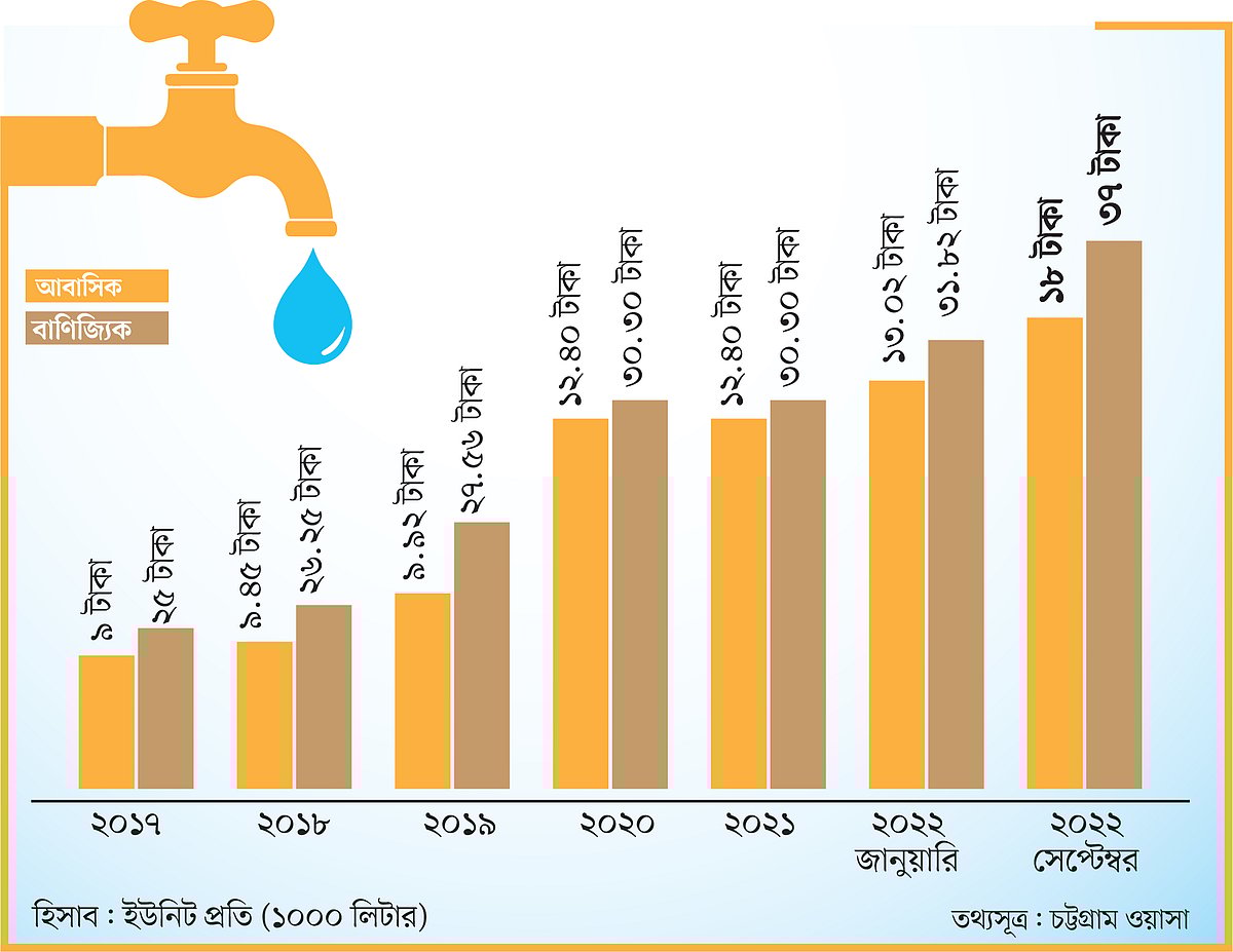 ওয়াসা সূত্র জানায়, বর্তমানে ওয়াসার আবাসিক গ্রাহক সংযোগ আছে ৭৮ হাজার ৫৪২টি ও বাণিজ্যিক সংযোগ সংখ্যা ৭ হাজার ৭৬৭টি। ২০০৯ সালে আওয়ামী লীগ সরকার দায়িত্ব নেওয়ার পর ১৩ বছরে চট্টগ্রাম ওয়াসার পানির দাম বেড়েছে ১২ বার। মাঝে গত বছর করোনা মহামারির কারণে ওয়াসা পানির দাম বাড়ায়নি।