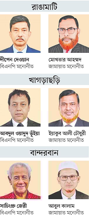 রাঙামাটি, খাগড়াছড়ি ও বান্দরবান জেলা নিয়ে পার্বত্য চট্টগ্রাম। এখানকার তিন আসনে প্রার্থী চূড়ান্ত করেছে বিএনপি ও জামায়াতে ইসলামী। আঞ্চলিক দল পার্বত্য চট্টগ্রাম জনসংহতি সমিতি (জেএসএস) এবং ইউনাইটেড পিপলস ডেমোক্রেটিক ফ্রন্ট (ইউপিডিএফ) প্রার্থী ঘোষণা করেনি।