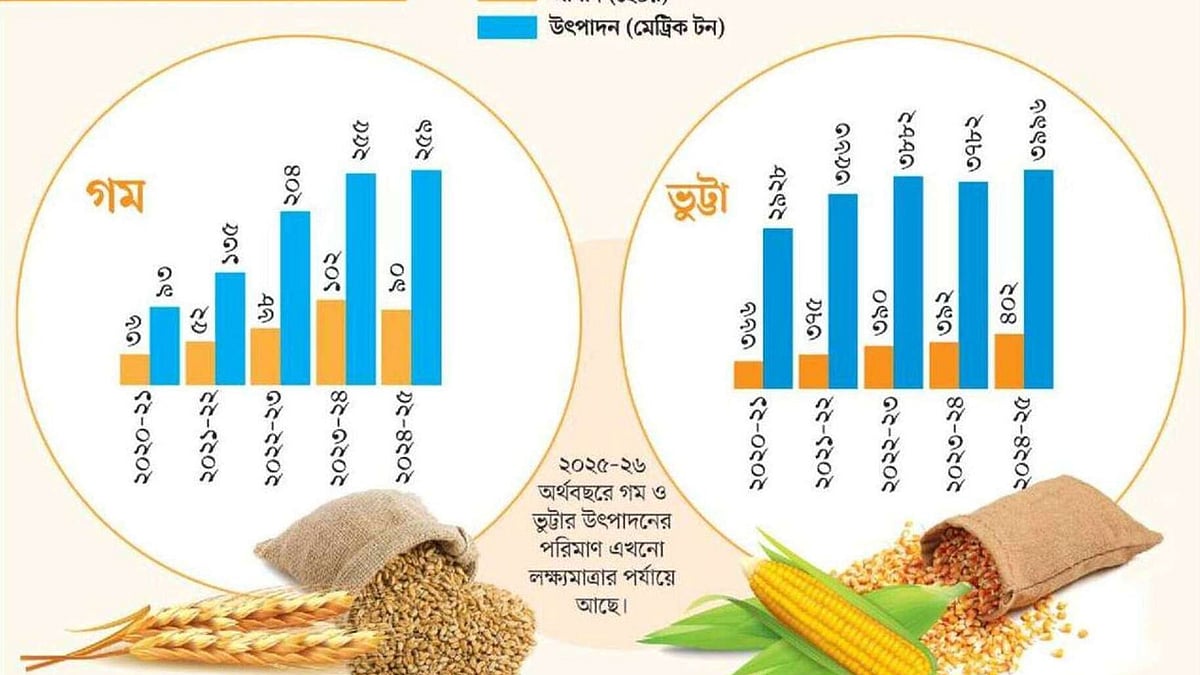 অন্যদিকে একই সময়ে ভুট্টার আবাদ তুলনামূলক স্থিতিশীল ছিল। ২০২০-২১ সালে ৩৬৬ হেক্টর জমিতে ২ হাজার ৯২৮ টন ভুট্টা উৎপাদিত হয়, আর ২০২৪-২৫ সালে তা বেড়ে দাঁড়ায় ৪০২ হেক্টর জমিতে ৩ হাজার ৯৯৬ টন। অর্থাৎ পাঁচ বছরে আবাদ বেড়েছে ১ দশমিক ১ গুণ, উৎপাদন ১ দশমিক ৪ গুণ। তবে চলতি মৌসুমে ভুট্টার আবাদ বা উৎপাদন বাড়ানো হচ্ছে না; কিছু এলাকায় কমানোও হচ্ছে।