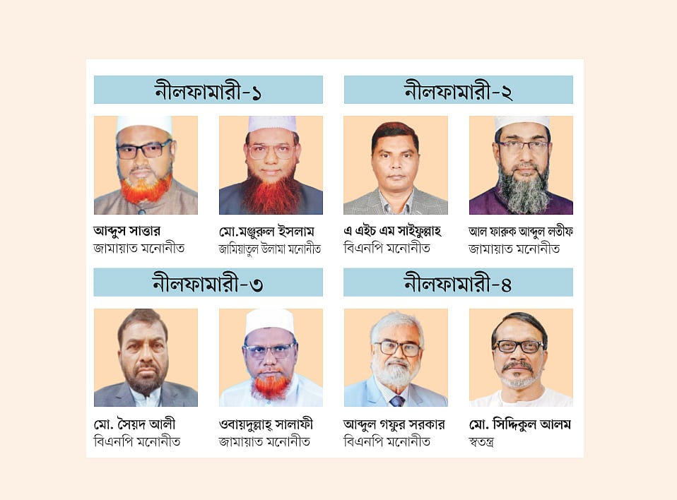 এ ছাড়া ইসলামী আন্দোলনের মো. হাচিবুল ইসলাম ও জেলা এনসিপির সদস্যসচিব চিকিৎসক কামরুল ইসলাম দলীয় মনোনয়নে নির্বাচন করার প্রস্তুতি নিচ্ছেন। কামরুল ইসলাম বলেন, ‘নীলফামারীর চারটি আসনের মধ্যে আমাদের দুটি আসনে প্রার্থী চূড়ান্ত হয়েছে। বাকি দুটির ব্যাপারে এখনো সিদ্ধান্ত হয়নি। আমরা ভোটারদের কাছে যাচ্ছি, ব্যাপক সাড়াও পাচ্ছি।’