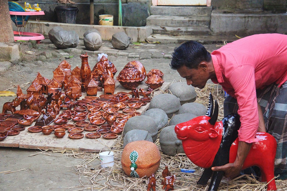 গ্রাম ঘুরে দেখা যায়, চাকা ঘুরিয়ে কাদামাটি দিয়ে বিশেষ কায়দায় ফুলদানি তৈরি করছিলেন রঞ্জিত পাল। রোদে সেগুলো শুকিয়ে আবার আগুনে পোড়ানো হয়। এভাবে পরিবারের চার সদস্য নিয়ে বাহারি তৈজসপত্র তৈরি করেন তিনি। পরে সেগুলো রং করে গ্রামের বিভিন্ন মেলায় নিয়ে যান।