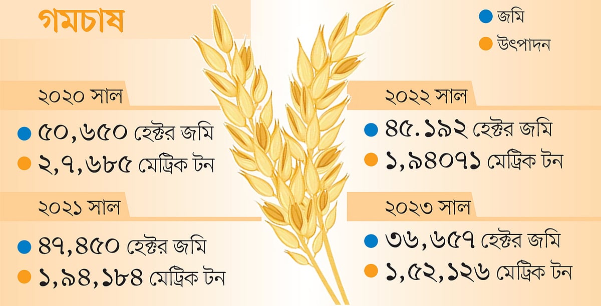 ২০২২ সালে ৪৫ হাজার ১৯২ হেক্টর জমিতে উৎপাদন হয় ১ লাখ ৯৪ হাজার ৭১ মেট্রিক টন গম। আর চলতি মৌসুমে ৪৪ হাজার ৬৯৯ হেক্টর জমিতে ১ লাখ ৮৫ হাজার ৫০১ মেট্রিক টন গম উৎপাদনের লক্ষ্যমাত্রা ধরা হয়েছে। কিন্তু আবাদ হয়েছে ৩৬ হাজার ৬৫৭ হেক্টর জমিতে। আর গম উৎপাদন হয়েছে ১ লাখ ৫২ হাজার ১২৬ মেট্রিক টন। অর্থাৎ ২০১৯ সালের পর থেকে চলতি বছর পর্যন্ত জেলায় গম আবাদের জমির পরিমাণ কমেছে ১৩ হাজার ৫৬৩ হেক্টর।