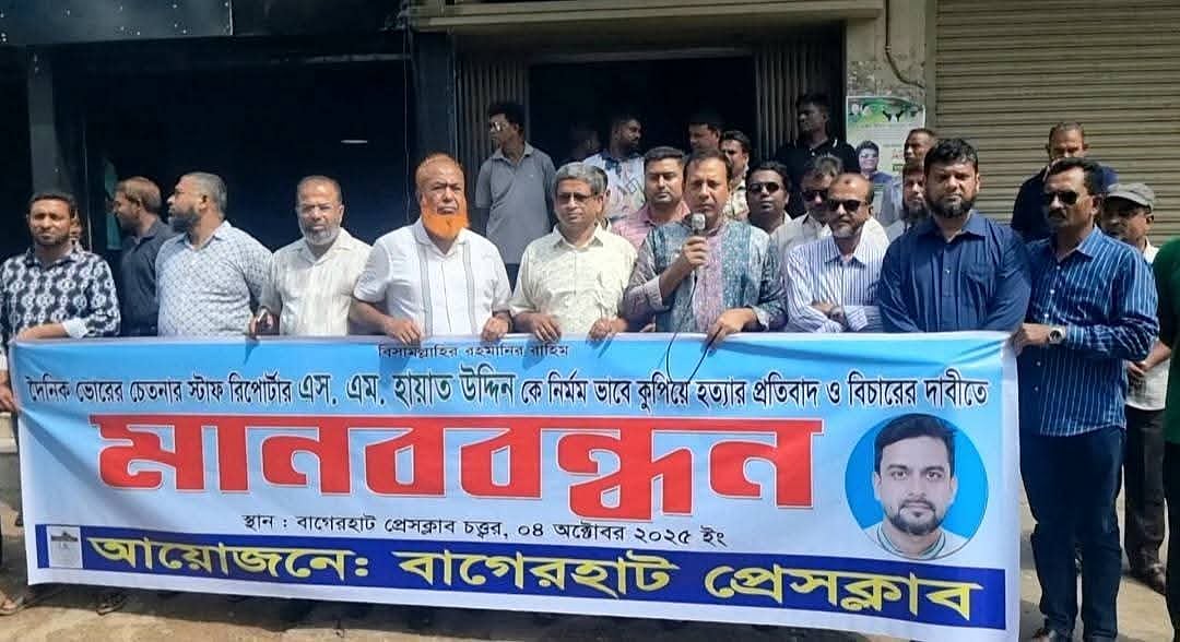 বাগেরহাটে বিএনপি নেতা ও সাংবাদিক এ এস এম হায়াত উদ্দিনকে হত্যার প্রতিবাদে মানববন্ধন হয়েছে। শনিবার দুপুরে বাগেরহাট প্রেসক্লাব আয়োজিত মানববন্ধনে সংবাদকর্মী ছাড়াও বিএনপির নেতারা একাত্মতা জানিয়ে অংশ নেন।