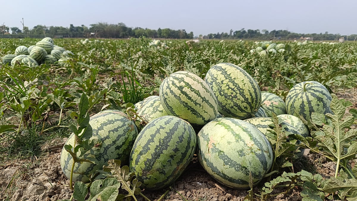 মাঠের পর মাঠ, যত দূর চোখ যায়, কেবল তরমুজের গাছ। সবুজ লতার ফাঁকে ফাঁকে উঁকি দিচ্ছে ডোরাকাটা আলপনা আঁকা নানা আকারের তরমুজ। কোথাও কোথাও মাঠের মধ্যে তরমুজ স্তূপ করে রাখা। দেশের বিভিন্ন স্থান থেকে পাইকারেরা এসে এসব তরমুজ কিনে নিয়ে যাচ্ছেন। শনিবার খুলনার উপকূলীয় কয়রা উপজেলার বিভিন্ন তরমুজখেত ঘুরে এমন চিত্র দেখা গেছে।