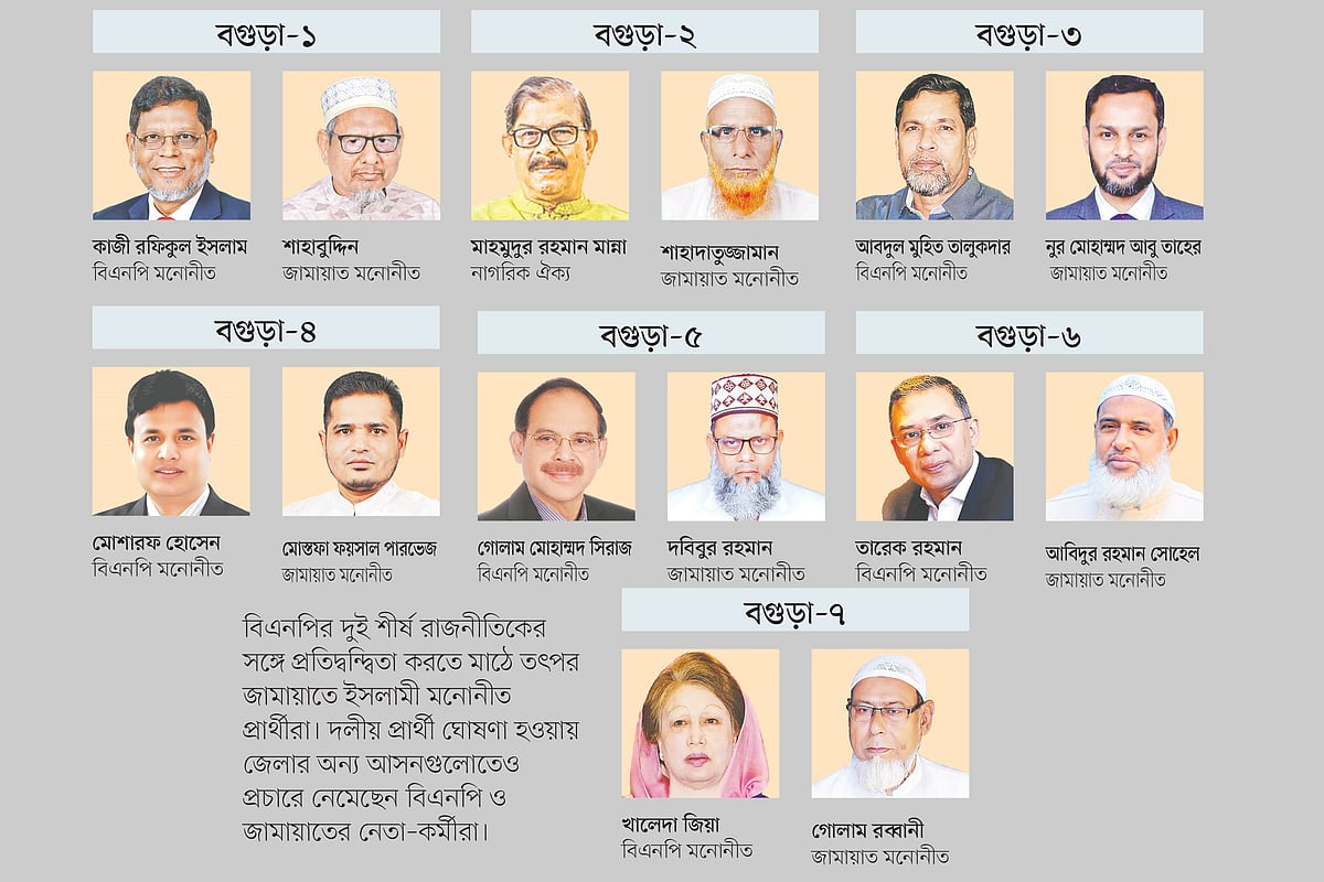 এ আসনে শহর জামায়াতের আমির আবিদুর রহমানকে (সোহেল) প্রার্থী করেছে দলটি। তিনি প্রথম আলোকে বলেন, জুলাই গণ–অভ্যুত্থানের পর বগুড়ার রাজনীতির চিত্র পাল্টে গেছে। বগুড়া কোনো দলের একক দুর্গ নয়, আগামী নির্বাচনে ভোটাররা তা প্রমাণ করে দেবেন।