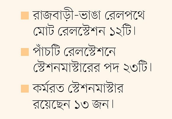 রেলওয়ে সূত্রে জানা গেছে, রাজবাড়ী-ভাঙা রেলপথে মোট রেলস্টেশন ১২টি। এসব রেলস্টেশনের মধ্যে পাঁচটি রেলস্টেশনে স্টেশনমাস্টারের পদ রয়েছে ২৩টি। কর্মরত স্টেশনমাস্টার রয়েছেন ১৩ জন। অপর দিকে সাতটি রেলস্টেশনে স্টেশনমাস্টার নেই। ১২টি স্টেশনের মধ্যে দ্বিতীয় শ্রেণির চারটি স্টেশন বসন্তপুর, অম্বিকাপুর, ফরিদপুর কলেজ ও বাখুন্ডায় স্টেশনমাস্টারের কোনো পদ নেই। খানখানাপুর, তালমা ও পুখুড়িয়া দ্বিতীয় গ্রেডের স্টেশন হলেও এগুলোতে স্টেশনমাস্টারের পদ রয়েছে। কিন্তু ওই পদগুলো শূন্য রয়েছে। বাকি রাজবাড়ী, পাচুড়িয়া, আমিরাবাদ, ফরিদপুর ও ভাঙ্গা স্টেশনগুলো প্রথম শ্রেণির। এর মধ্যে রাজবাড়ী, ফরিদপুর ও ভাঙ্গা গুরুত্বপূর্ণ স্টেশন।