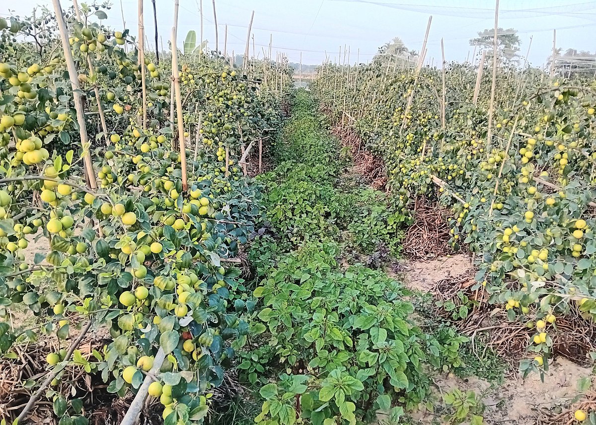 গত রোববার বিকেলে সরেজমিন দেখা যায়, বাঁশের বেড়ায় ঘেরা ১ বিঘা জমিতে ২৩০টি আপেল ও বলসুন্দরী কুলগাছ, যেগুলোর সব গাছে কমবেশি ফলন এসেছে এবং ফলের ভারে গাছগুলো নুয়ে পড়েছে। কুলগাছের প্রতিটি সারির মাঝখানে ফাঁকা স্থানে ডাঁটাশাক লাগানো হয়েছে।
