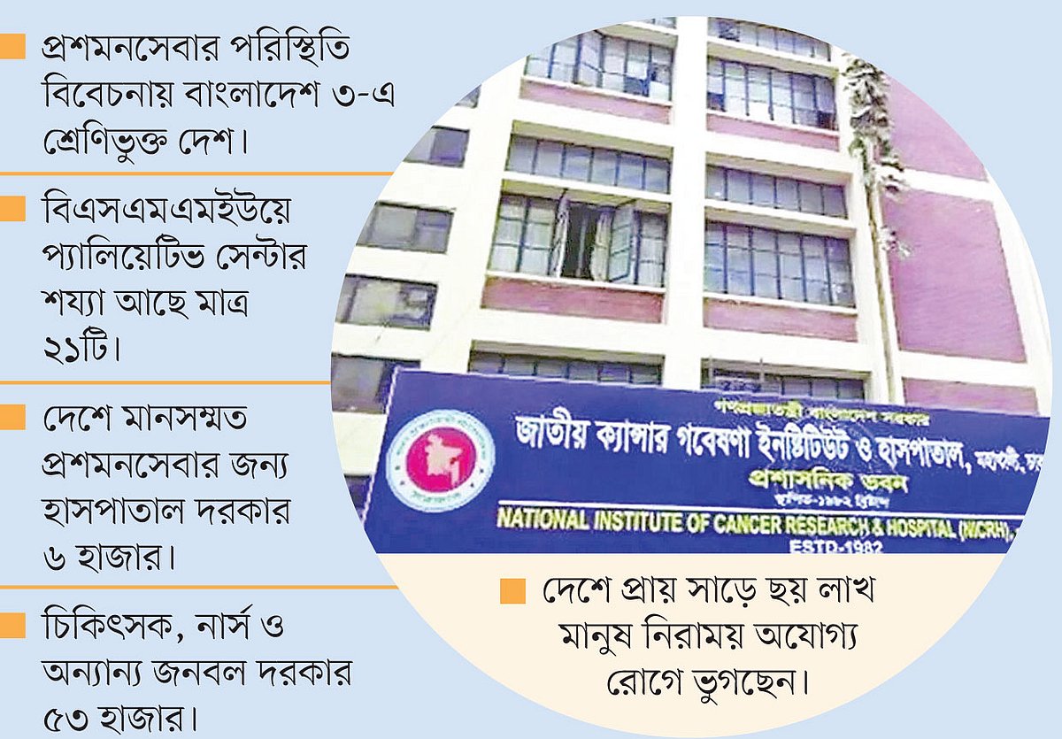 দেশের পরিস্থিতি জানতে সরকারের জাতীয় জনসংখ্যা গবেষণা ও প্রশিক্ষণ প্রতিষ্ঠান (নিপোর্ট), বিএসএমএমইউ এবং বেসরকারি প্রতিষ্ঠান সেন্টার ফর প্যালিয়েটিভ কেয়ার যৌথভাবে ২০১৪ সালে একটি মূল্যায়ন প্রতিবেদন তৈরি করেছিল। প্রতিবেদনে বলা হয়েছিল, দেশের নিরাময় অযোগ্য রোগে আক্রান্তদের চিকিৎসার জন্য ছয় হাজার হাসপাতাল এবং চিকিৎসক, নার্স ও অন্যান্য স্বাস্থ্যকর্মীসহ ৫৩ হাজার জনবল দরকার।