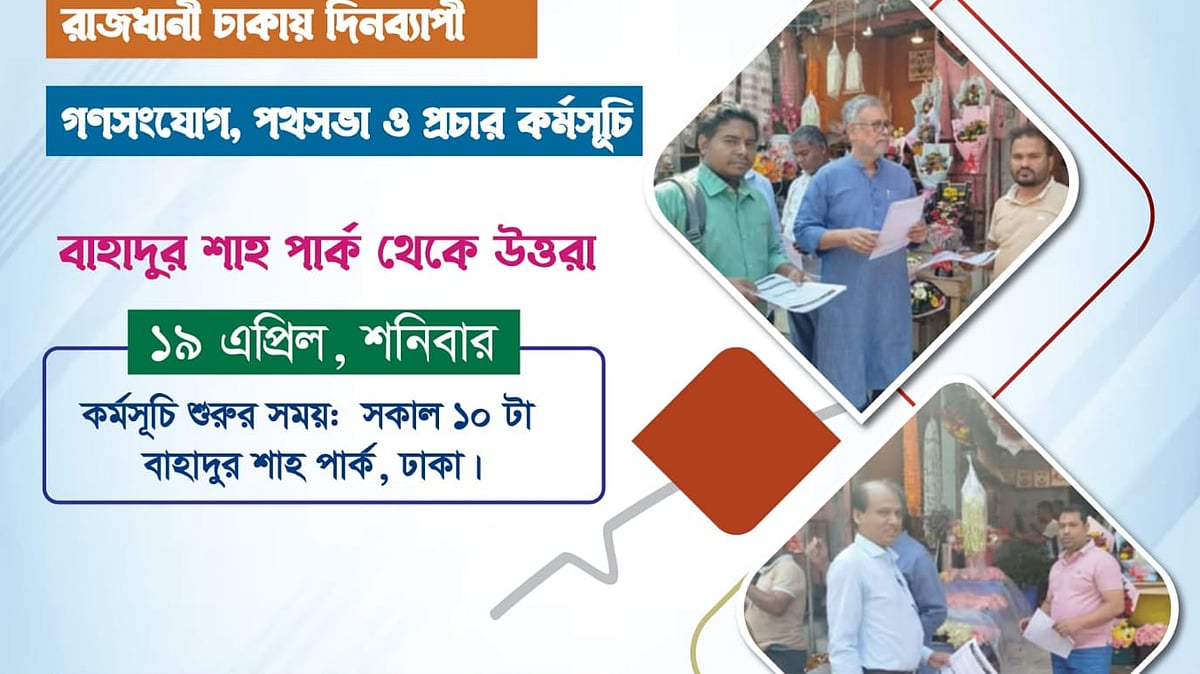 বিজ্ঞপ্তিতে বলা হয়েছে, গণসংযোগ চলাকালে রাজধানীর বিভিন্ন এলাকায় ছয়টি পথসভা অনুষ্ঠিত হবে। প্রথম পথসভাটি হবে পুরান ঢাকার বাহাদুর শাহ পার্কে। এরপর প্রেসক্লাব, শাহবাগ, ফার্মগেট, মিরপুর-১০ ও উত্তরার রাজলক্ষ্মীতে পথসভা করা হবে। দিনব্যাপী কর্মসূচির রুটটি হচ্ছে বাহাদুর শাহ পার্ক-প্রেসক্লাব-টিএসসসি-শাহবাগ-ফার্মগেট-শ্যামলী-মিরপুর ১-মিরপুর ১০-ইসিবি চত্বর-বিমানবন্দর-উত্তরা।