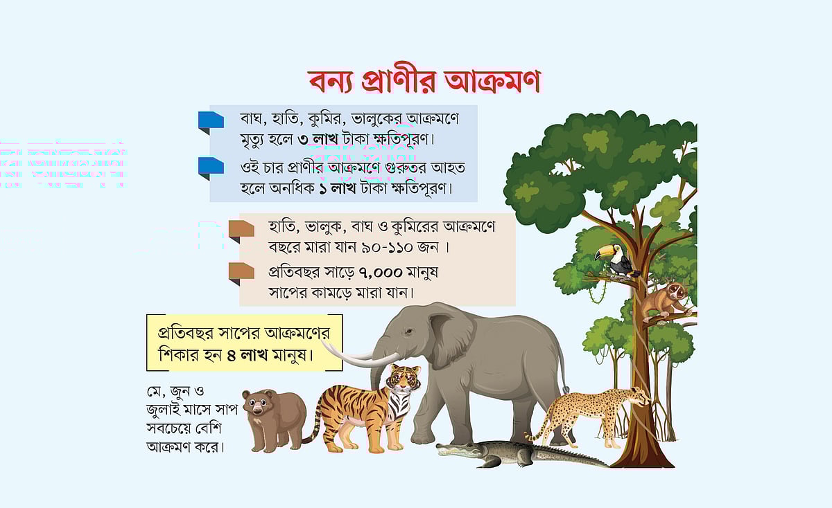 বন বিভাগ সূত্রে জানা গেছে, বাংলাদেশে বছরে ৯০ থেকে ১১০ জন হাতি, ভালুক, বাঘ ও কুমিরের আক্রমণে মারা যান। তাঁদের পরিবারের পক্ষ থেকে আবেদনের পরিপ্রেক্ষিতে ক্ষতিপূরণ দেওয়া হয়। আহত ব্যক্তিরাও ক্ষতিপূরণ পান। এ জন্য নির্দিষ্ট ফরমে প্রমাণসহ আবেদন করতে হয়। প্রক্রিয়াটি জটিল হওয়ায় অনেকে ওই আবেদন করতে পারেন না।