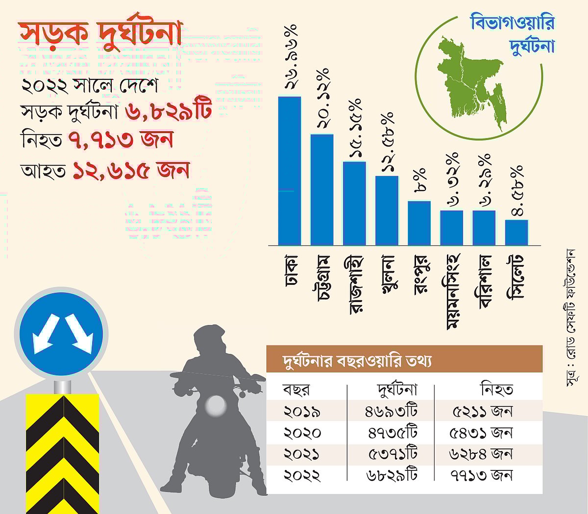 নিরাপদ সড়ক চাই এবং রোড সেফটি ফাউন্ডেশনের তথ্য অনুযায়ী, গত বছর ঢাকা বিভাগে সবচেয়ে বেশি দুর্ঘটনা ও প্রাণহানি ঘটেছে। প্রায় ২৭ শতাংশ দুর্ঘটনা এবং মৃত্যু ঘটেছে ঢাকা বিভাগে। রোড সেফটির তথ্য অনুযায়ী, ঢাকা বিভাগে ১ হাজার ৮৪১টি দুর্ঘটনায় নিহত হয়েছে ২ হাজার ৪৪ জন। দ্বিতীয় সর্বোচ্চ মৃত্যু চট্টগ্রাম বিভাগে। আর সবচেয়ে কম মৃত্যু হয়েছে সিলেট বিভাগে।