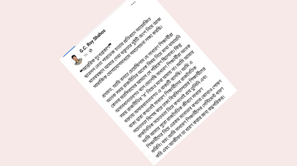 গণেশ চন্দ্র রায় আরও লিখেছেন, ‘ছাত্রদল নেতা পারভেজ হত্যার প্রতিবাদে আয়োজিত মানববন্ধনে আমার দেওয়া বক্তৃতার দুটি অংশ নিয়ে সামাজিক যোগাযোগমাধ্যমে সমালোচনা লক্ষ করছি। প্রথমত, আমি বলতে চেয়েছিলাম যে সাধারণ শিক্ষার্থীরা অনেক সময় রাজনীতির অনেক বিষয় নিয়ে মাথা ঘামাননি। কেননা ফ্যাসিবাদের আমলে সে পরিবেশ ছিল না। কিন্তু অসাবধানতাবশত বলে ফেলেছি সাধারণ শিক্ষার্থীরা অনেক সময় রাজনীতির “র” নিয়েও মাথা ঘামান না। আমি আমার বক্তব্যে অসাবধানতাবশত এ বাক্যটি বলেছি।’
