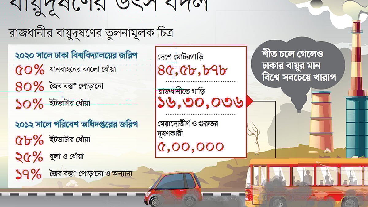 এ থেকে দেখা যাচ্ছে, রাজধানীর বায়ুদূষণের উৎসের একটি বড় বদল ঘটে গেছে। এক যুগ ধরে ঢাকার বায়ুদূষণের প্রধান উৎস হিসেবে ইটভাটাকে মনে করা হতো। কিন্তু এই জরপি বলছে, ঢাকার বাতাসে দূষিত বস্তুর উৎস হিসেবে ইটভাটার স্থান দখল করেছে যানবাহন ও শিল্পকারখানার ধোঁয়া।