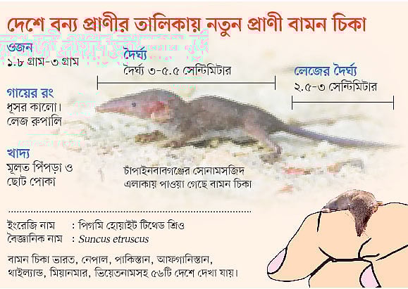 দেশে প্রাণীর তালিকায় যুক্ত হলো নতুন একটি স্তন্যপায়ী প্রাণী। বামন চিকা নামের এই প্রাণী চাঁপাইনবাবগঞ্জের সোনামসজিদ এলাকায় দেখা গেছে। বন্য প্রাণী বিশেষজ্ঞরা বলছেন, এটি এখন পর্যন্ত দেশে সবচেয়ে ছোট স্তন্যপায়ী প্রাণী।