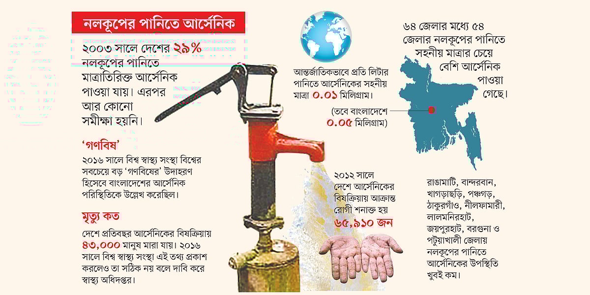 সারা দেশে পানি সরবরাহের দায়িত্ব (ঢাকা, চট্টগ্রাম, রাজশাহী, খুলনা ওয়াসার আওতাধীন এলাকা বাদে) জনস্বাস্থ্য প্রকৌশল অধিদপ্তরের (ডিপিএইচই)। সর্বশেষ ২০০৩ সালে দেশের নলকূপের আর্সেনিক পরীক্ষা করা হয়েছিল। জনস্বাস্থ্য প্রকৌশল অধিদপ্তরের আর্সেনিক ব্যবস্থাপনা বিভাগের নির্বাহী প্রকৌশলীহুমায়ুন কবির প্রথম আলোকে বলেন, ২০০৩ সালে দেশের ২৯ শতাংশ নলকূপের পানিতে মাত্রাতিরিক্ত আর্সেনিক পাওয়া যায়। এরপর গত ১৭ বছরে কোনো সমীক্ষা হয়নি। ফলে দেশের কত নলকূপে এখন সহনীয় মাত্রার চেয়ে বেশি আর্সেনিক রয়েছে, সেটি বোঝার কোনো উপায় নেই। তবে কেউ চাইলে এখনো নলকূপে স্বাভাবিক মাত্রার চেয়ে বেশি পরিমাণে আর্সেনিক রয়েছে কি না, সেই পরীক্ষা বিনা মূল্যে করাতে পারে। এ জন্য উপজেলা জনস্বাস্থ্য প্রকৌশল অধিদপ্তরের কার্যালয়ে যোগাযোগ করতে হবে।