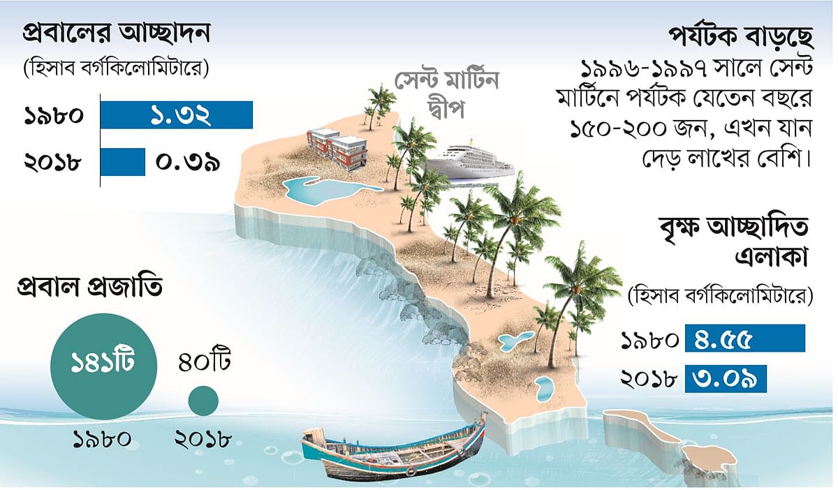 ঢাকা বিশ্ববিদ্যালয়ের দুই শিক্ষক ও এক শিক্ষার্থীর এক গবেষণায় উঠে এসেছে সেন্ট মার্টিনের দুর্দশার এ চিত্র। একটি উদাহরণ দেওয়া যাক, চার দশক আগে দ্বীপটির যতটুকু ভূমি প্রবালে আচ্ছাদিত ছিল, তার তিন ভাগের এক ভাগও এখন অবশিষ্ট নেই। কোরাল বা প্রবাল—এক ধরনের অমেরুদণ্ডী সামুদ্রিক প্রাণী। বহিরাবরণ শক্ত হওয়ার কারণে অনেক সময় একে ভুল করে পাথর ভাবা হয়। পলিপ নামের অসংখ্য ক্ষুদ্র ক্ষুদ্র প্রাণীর সমন্বয়ে তৈরি হয় একটি প্রবাল।