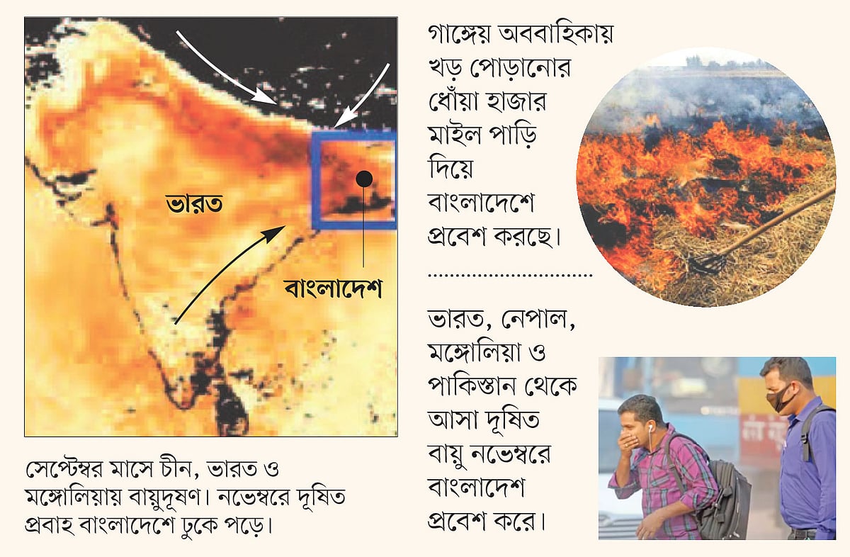 ওই বিজ্ঞান সাময়িকীতে ঢাকাসহ বিশ্বের চারটি শহরের শীতকালীন বায়ুদূষণ নিয়ে করা গবেষণা প্রতিবেদন রয়েছে। এতে বলা হয়েছে, ভারতের ইন্দো–গাঙ্গেয় অববাহিকা এলাকায় ফসল কাটার পর খড় পুড়িয়ে ফেলা হয়। এর ফলে সৃষ্ট ধোঁয়া শুধু দিল্লি শহরকে দূষণ করছে না, তা হাজার মাইল পাড়ি দিয়ে বাংলাদেশেও প্রবেশ করছে। ভারত, নেপাল, মঙ্গোলিয়া ও পাকিস্তানের গ্রামাঞ্চলে শুষ্ক মৌসুমে শীত থেকে রক্ষার জন্য মানুষ বাড়িতে কাঠ, তুষ ও খড় পোড়ায়। রান্নাসহ অন্যান্য কাজেও গ্রামের মানুষ জৈব জ্বালানি ব্যবহার করে। এতে সৃষ্ট দূষিত বায়ুর প্রবাহ নভেম্বরে বাংলাদেশে প্রবেশ করে, যা বাংলাদেশের বায়ুকে আরও দূষিত করে তোলে।