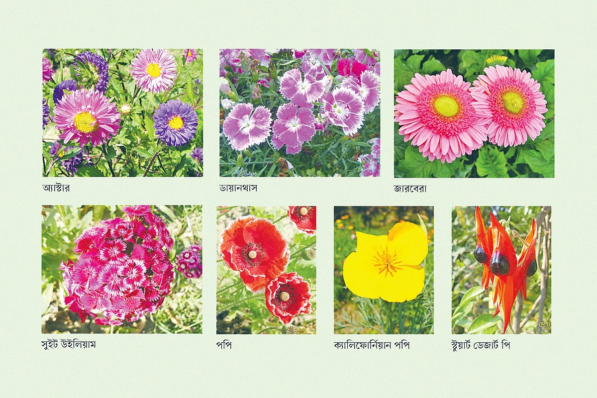 আমাদের দেশে এসব ফুলের অধিকাংশই এসেছে শীতের দেশ থেকে। তবুও কয়েক জাতের ফুল আমাদের প্রকৃতির সঙ্গে মিশে গেছে দারুণভাবে। রংবেরঙের এসব ফুলের মধ্যে আছে গাঁদা, ডালিয়া, চন্দ্রমল্লিকা, কসমস, সালভিয়া, ভারবেনা, ডায়ানথাস, ক্যালেন্ডুলা, পপি, অ্যাস্টার, জিনিয়া ইত্যাদি। বর্ণবৈচিত্র্যের কারণে অ্যাস্টার সারা পৃথিবীতেই জনপ্রিয় ফুল। এ ফুলের অনেক রং—নীল, রক্তলাল, সাদা, গাঢ় লাল, হলুদ ও বেগুনি। তবে নীল অ্যাস্টার সবচেয়ে দৃষ্টিনন্দন। ডালিয়া মৌসুমি ফুলের মধ্যে সবচেয়ে নজরকাড়া। এ ফুলের বিচিত্র গড়ন আর রঙের শেষ নেই। পাপড়ির সংখ্যাও অনেক। চন্দ্রমল্লিকার জন্মস্থান চীন আর সমাদর জাপানে। কারণ, চন্দ্রমল্লিকা জাপানের জাতীয় ফুল।