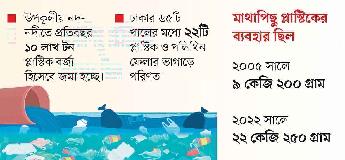গবেষণায় বলা হয়, ঢাকা শহরে বর্ষাকালে যে বৃষ্টি হয়, তা ৬৫টি খালের মাধ্যমে নদীতে গিয়ে পড়ে। কিন্তু এসব খালের ২২টি প্লাস্টিক ও পলিথিন ফেলার ভাগাড়ে পরিণত হয়েছে। ফলে বৃষ্টির পানি নামতে না পারায় ঢাকায় জলাবদ্ধতা বাড়ছে। দেশের উপকূলীয় নদ-নদীগুলোতে প্রতিবছর ১০ লাখ টন প্লাস্টিক বর্জ্য হিসেবে জমা হচ্ছে, যা নদীগুলোর মাছের পেটে মাইক্রো প্লাস্টিক হিসেবে জমা হচ্ছে। এসব অতি ক্ষুদ্র প্লাস্টিক কণা মাছের মাধ্যমে মানুষের শরীরে প্রবেশ করছে। তৈরি করছে উচ্চ রক্তচাপ, ক্যানসারসহ নানা ধরনের রোগ।