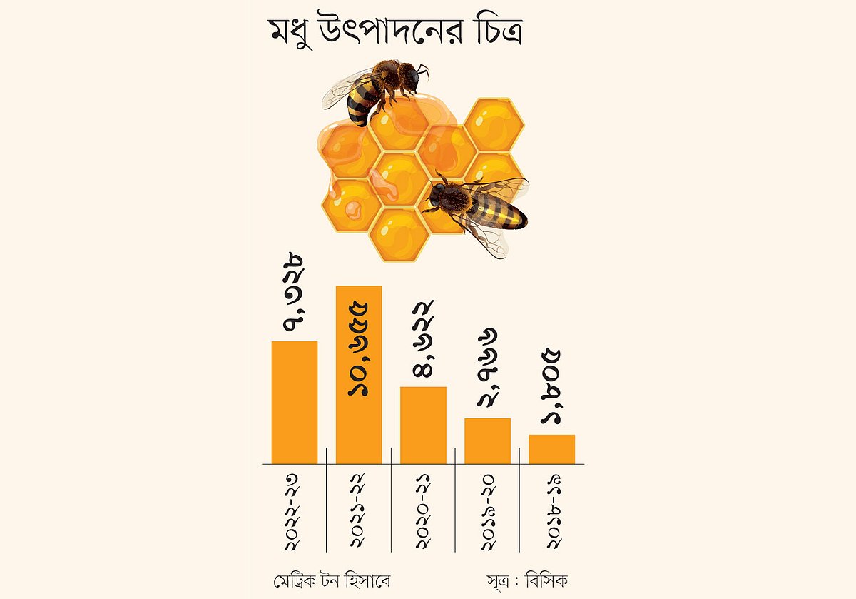 বাংলাদেশ ক্ষুদ্র ও কুটির শিল্প করপোরেশনের (বিসিক) তথ্য অনুযায়ী, সাম্প্রতিক বছরগুলোয় দেশে মধু উৎপাদন বাড়ছিল। ২০২১-২২ অর্থবছরে দেশে ১০ হাজার ৬৫৫ মেট্রিক টন মধু উৎপাদন করা হয়, যা গত ১১ বছরের মধ্যে ছিল সর্বোচ্চ। কিন্তু তার পরের বছর (২০২২-২৩) মধু উৎপাদন কমে দাঁড়ায় ৭ হাজার ৩২৮ মেট্রিক টনে। অর্থাৎ এক বছরের ব্যবধানে মধু উৎপাদন ৩১ শতাংশ কমে গেছে।