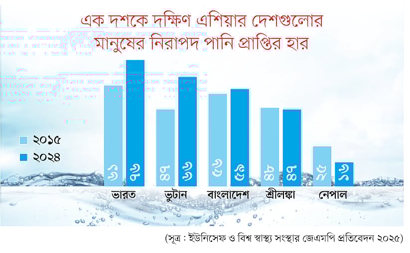 এক দশকে নিরাপদ পানি প্রাপ্তির দিক থেকে দক্ষিণ এশিয়ার দেশগুলোর মধ্যে এগিয়ে ভারত। দেশটিতে এখন ৭৬ শতাংশ মানুষ নিরাপদ পানি পায়। ২০১৫ সালে এ হার ছিল ৬১ শতাংশ। ভুটানের ৬৬ শতাংশ মানুষ নিরাপদ পানির আওতায় আছে। ২০১৫ সালে এর হার ছিল ৪৭ শতাংশ। এ ক্ষেত্রে সবচেয়ে পিছিয়ে নেপাল। দেশটির ১৬ শতাংশ মানুষ নিরাপদ পানি পায়। পাকিস্তানের ৪৫ শতাংশ মানুষ এখন নিরাপদ পানি পায়। এক দশক আগে এ হার ছিল ৪৪ শতাংশ। অর্থাৎ এক দশকে দেশটি মাত্র ১ শতাংশ এগিয়েছে।