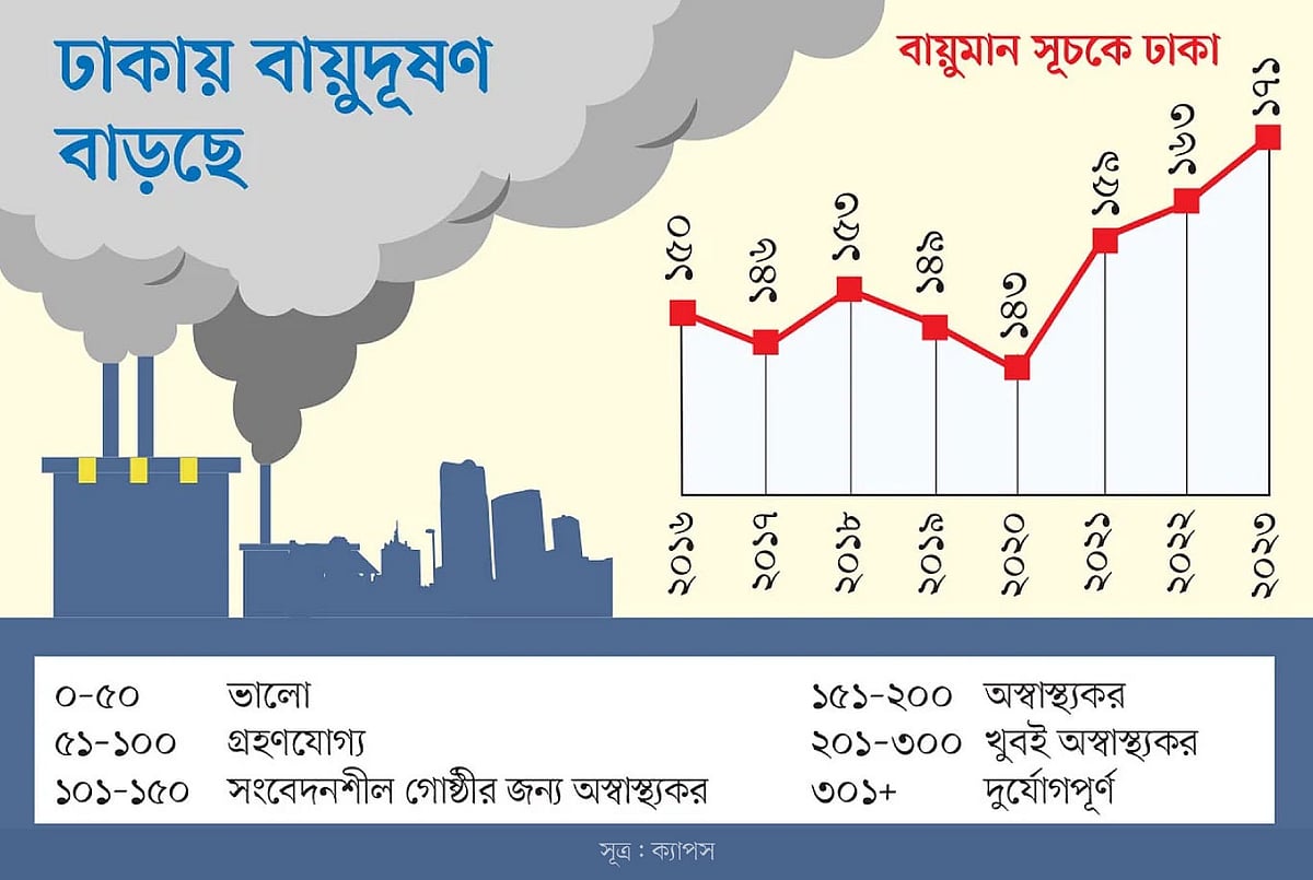 ক্যাপসের চেয়ারম্যান আহমদ কামরুজ্জামান মজুমদার প্রথম আলোকে বলেন, ‘ভীতিকর দিকটি হলো ২০২০ সালের পর থেকে ঢাকার গড় বায়ুমান নম্বর বাড়ছে। মানে হলো দূষণ বাড়ছে। কিন্তু দূষণ নিয়ন্ত্রণে কার্যকর পদক্ষেপ নেওয়া হচ্ছে না। দূষণের উৎসগুলো নিয়ন্ত্রণে একধরনের নির্লিপ্ততা চোখে পড়ছে।’