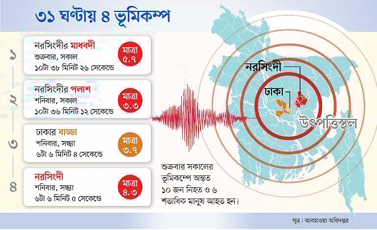 গত শুক্র ও গতকাল শনিবার প্রায় ৩১ ঘণ্টার মধ্যে ঢাকা ও এর আশপাশে চারটি ভূমিকম্পের ঘটনা এমন ঝুঁকির বিষয়টি সামনে এনেছে। এর মধ্যে শুক্রবার সকালে ঢাকা থেকে প্রায় ২৫ কিলোমিটার দূরে রিখটার স্কেলে ৫ দশমিক ৭ মাত্রার ভূমিকম্পটির উৎস ছিল নরসিংদীর মাধবদী। উৎপত্তিস্থলের গভীরতা ছিল ভূপৃষ্ঠ থেকে ১০ কিলোমিটার গভীরে।