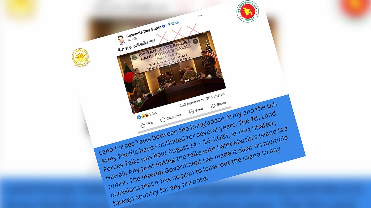 সেন্ট মার্টিন দ্বীপ নিয়ে ‘সুশান্ত দাস গুপ্ত’ নামের একজন ফেসবুক ব্যবহারকারী তাঁর পোস্টে ‘বাংলাদেশ সেনাবাহিনী এবং যুক্তরাষ্ট্রের আর্মি প্যাসিফিকের মধ্যে ল্যান্ড ফোর্সেস টকস’–এর একটি ছবি শেয়ার করে প্রশ্ন করেন, ‘ডিল ডান?’ ‘সেন্ট মার্টিন গন?’