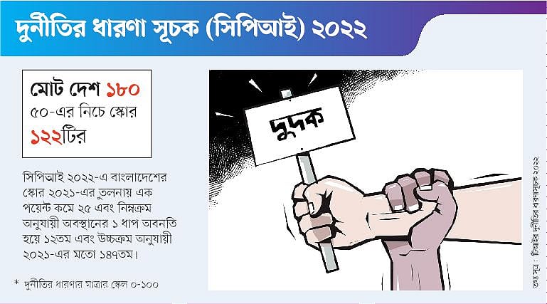দুর্নীতিবিরোধী আন্তর্জাতিক সংস্থা ট্রান্সপারেন্সি ইন্টারন্যাশনাল (টিআই) দুর্নীতির ধারণা সূচকের যে প্রতিবেদন প্রকাশ করে থাকে, তাতে গত ১০ বছরের স্কোর বিশ্লেষণ করে দেখা যায়, বাংলাদেশের স্কোরের কোনো পরিবর্তন হয়নি। এই স্কোর ২৪ থেকে ২৬-এর মধ্যে স্থবির হয়ে আছে। যদিও সবচেয়ে বেশি দুর্নীতিগ্রস্ত দেশগুলোর মধ্যে বাংলাদেশের অবস্থান এক বা দুই ধাপ ওঠানামা করেছে; কিন্তু স্কোরের কোনো পরিবর্তন না হওয়ায় এটি এক দশকে দুর্নীতি নিয়ন্ত্রণে ব্যর্থতার প্রমাণ দিচ্ছে।