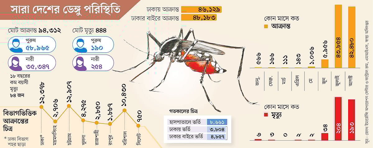 গতকাল বৃহস্পতিবার স্বাস্থ্য অধিদপ্তরের হেলথ ইমার্জেন্সি অপারেশন সেন্টার ও কন্ট্রোল রুম ডেঙ্গুতে আরও ৯ জনের মৃত্যুর তথ্য দিয়েছে। এ নিয়ে এ বছর ডেঙ্গুতে মৃত্যু হলো ৪৪৪ জনের। ডেঙ্গুতে এক বছরে এত মৃত্যু আগে কখনো হয়নি। এবার মৃতদের মধ্যে ১৮ বছরের কম বয়সী শিশু ৮৪ জন। অন্যদিকে ডেঙ্গুতে এ পর্যন্ত সারা দেশের হাসপাতালে ভর্তি হয়েছেন ৯৪ হাজার ৩১২ জন।