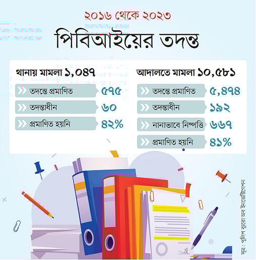 পিবিআইয়ের ৪৭টি জেলা ইউনিট ৮ বছরে থানায় হওয়া ১ হাজার ৪৭টি মামলা তদন্ত করেছে। তদন্তে ৫৭৫টি মামলায় অভিযোগপত্র এবং ৪১২টি মামলায় চূড়ান্ত প্রতিবেদন দেয়। প্রতিবেদন প্রকাশের সময় বাকি ৬০টি মামলার তদন্ত চলছিল। এ ক্ষেত্রে দেখা যায়, ৪২ শতাংশ মামলা প্রমাণিত হয়নি।