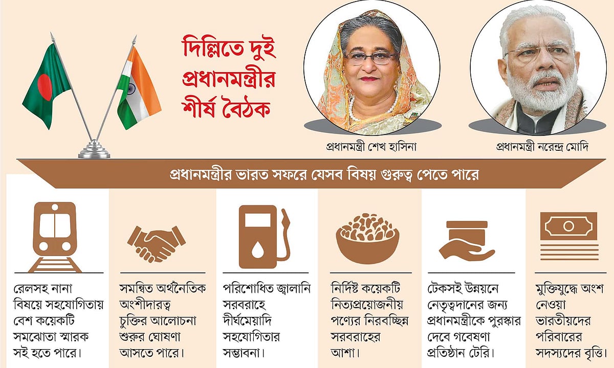 প্রধানমন্ত্রী শেখ হাসিনা চার দিনের রাষ্ট্রীয় সফরে ৫ সেপ্টেম্বর ভারতে যাচ্ছেন। পরদিন তিনি ভারতের প্রধানমন্ত্রী নরেন্দ্র মোদির সঙ্গে দিল্লির হায়দরাবাদ হাউসে শীর্ষ বৈঠকে অংশ নেবেন। দুই দেশের প্রতিনিধি পর্যায়ে আলোচনা শেষে বেশ কয়েকটি সমঝোতা স্মারক সইয়ের প্রস্তুতি চলছে।