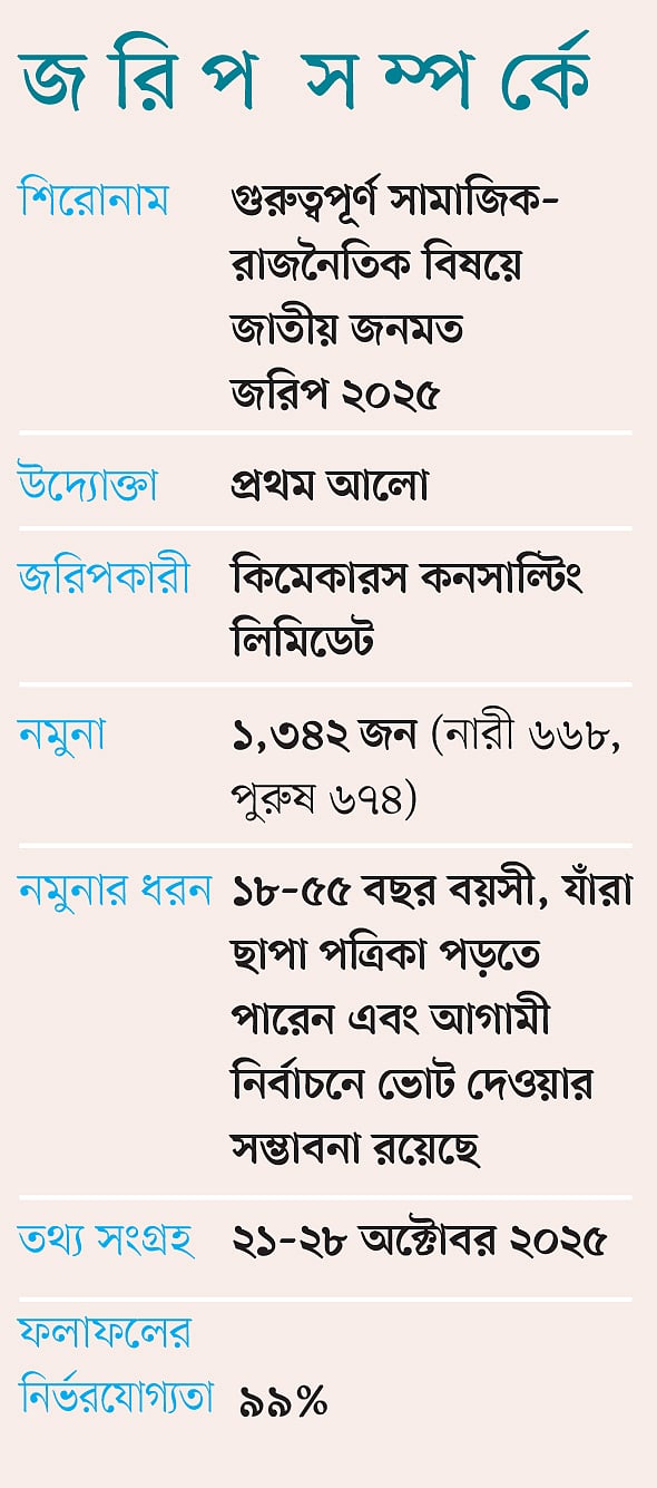 দেশে ভোটারের সংখ্যা ১২ কোটি ৭৬ লাখের বেশি। এটি মাথায় রেখে আমরা ১ হাজার ৩৪২ জনের নমুনা নির্বাচন করেছি, যাতে ফলাফলের নির্ভরযোগ্যতা (কনফিডেন্স লেভেল) ৯৯ শতাংশের ওপরে এবং ভুলের পরিধি (মার্জিন অব এরর) ২ দশমিক ৭ শতাংশের নিচে থাকে। সুতরাং গুরুত্বপূর্ণ সামাজিক-রাজনৈতিক বিষয়ে প্রথম আলোর জাতীয় জনমত জরিপ-২০২৫–এর ফলাফলকে অনায়াসে গ্রহণযোগ্য বলা যায়। এমনকি আলাদাভাবে নারী মতামতদাতা ও পুরুষ মতামতদাতাদের জরিপের ফলাফলও গ্রহণযোগ্য ফলের নির্ভরযোগ্যতা ৯৯ শতাংশ ও ভুলের পরিধি ৩ দশমিক ৮ শতাংশের নিচে আছে।