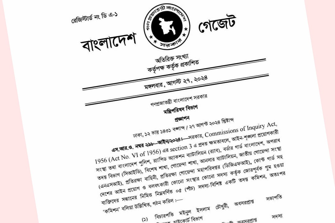 অবসরপ্রাপ্ত বিচারপতি মইনুল ইসলাম চৌধুরীর নেতৃত্বে পাঁচ সদস্যের ওই কমিশন গঠন করে গতকাল মঙ্গলবার প্রজ্ঞাপন জারি করেছে মন্ত্রিপরিষদ বিভাগ। কমিশনকে তদন্ত করে ৪৫ কার্যদিবসের মধ্যে সরকারের কাছে প্রতিবেদন জমা দিতে বলা হয়েছে।