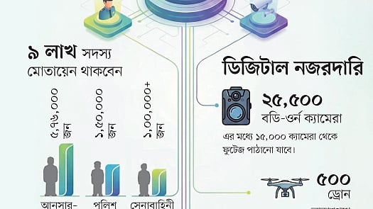 ডিজিটাল নজরদারির জন্য আনা সরঞ্জাম পরিচালনাসহ নির্বাচনে সামগ্রিক নিরাপত্তা নিশ্চিতে এবার নির্বাচনে আইনশৃঙ্খলা রক্ষাকারী বাহিনীর ৯ লাখের মতো সদস্য দায়িত্ব পালন করবেন।