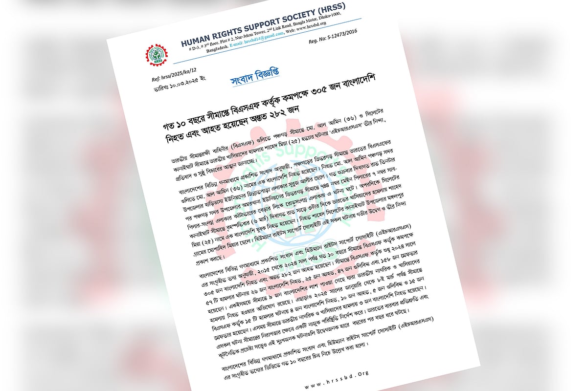 এইচআরএসএস জানিয়েছে, সীমান্তে ২০২৪ সালে ৫৭টি ঘটনায় বিএসএফের হাতে ২৬ বাংলাদেশি নিহত ও ২৫ জন আহত হয়েছেন। এ ছাড়া ১৫৮ জনকে গ্রেপ্তার করে বিএসএফ। একই সময়ে সীমান্তে ৯ জন বাংলাদেশির লাশ পাওয়া যায়, যাঁরা ভারতের নাগরিক ও খাসিয়াদের হামলায় নিহত হন বলে অভিযোগ রয়েছে। এ ছাড়া ২০২৫ সালের জানুয়ারি থেকে ৮ মার্চ পর্যন্ত সীমান্তে ১৫টি ঘটনায় বিএসএফের হাতে ৪ বাংলাদেশি নিহত ও ১০ জন আহত হয়েছেন। গ্রেপ্তার করা হয়েছে ১৫ জনকে। এ সময়ে সীমান্তে ভারতের নাগরিক ও খাসিয়াদের হামলায় ৩ জন বাংলাদেশি নিহত হয়েছেন।