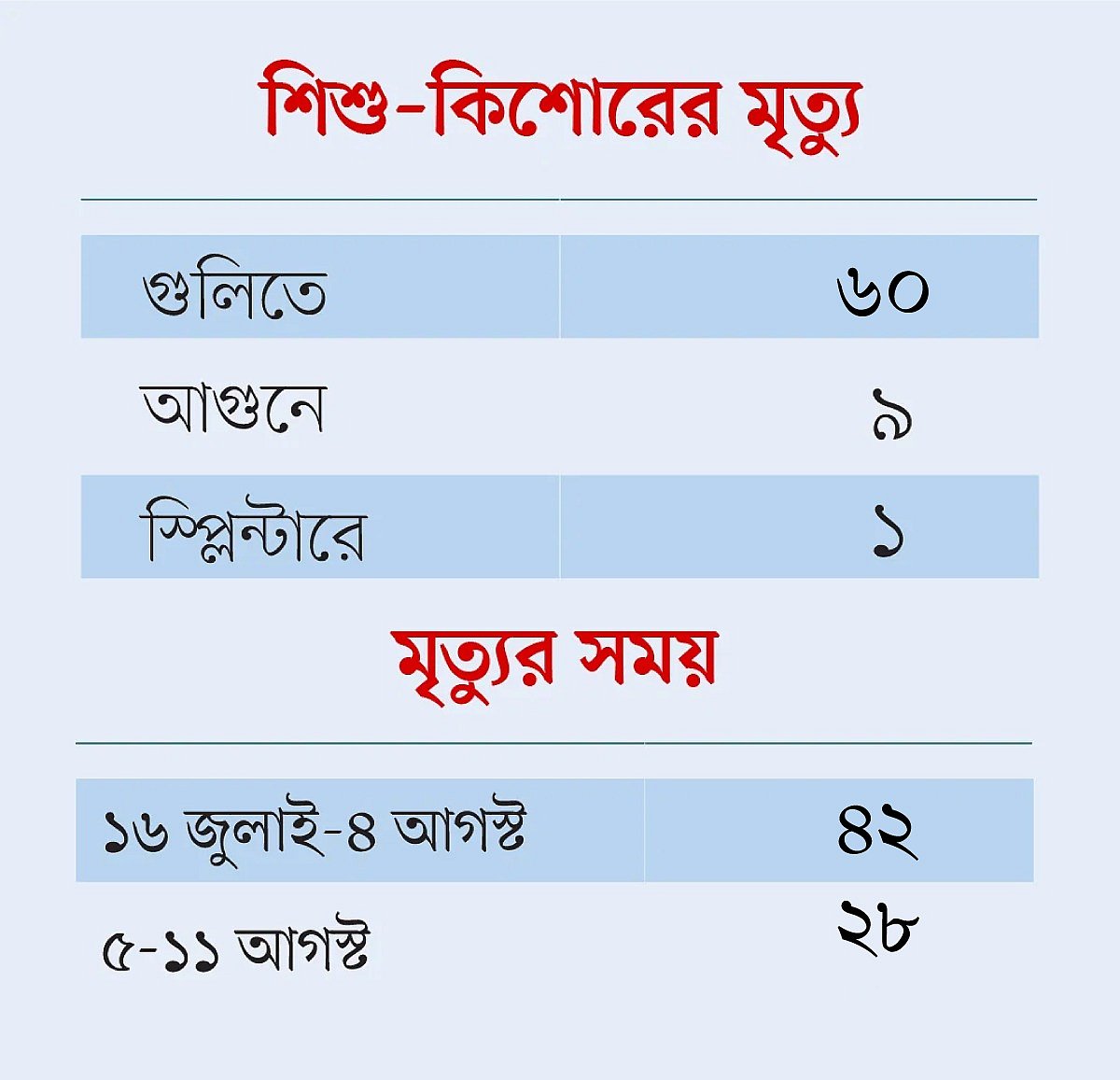 সরকারি চাকরিতে কোটা সংস্কার দাবির আন্দোলনকে কেন্দ্র করে প্রথম মৃত্যুর ঘটনা ঘটে গত ১৬ জুলাই। ওই দিন ছয়জন নিহত হন। তাঁদের মধ্যে শিশু-কিশোর ছিল না। শিশু-কিশোর মৃত্যুর প্রথম ঘটনা ঘটে ১৮ জুলাই। ওই দিন থেকে ৪ আগস্ট পর্যন্ত নিহত ব্যক্তিদের মধ্যে অন্তত ৪২ জন শিশু-কিশোর। এ ছাড়া ৫ থেকে ১১ আগস্টের মধ্যে আরও ২৮ শিশু-কিশোরের মৃত্যুর তথ্য পাওয়া যায়।