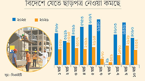 মধ্যপ্রাচ্যে যুদ্ধের মধ্যে গত বছরের তুলনায় এই সময়ে কাজের জন্য বিদেশ যাওয়া কমেছে। বাংলাদেশ জনশক্তি, কর্মসংস্থান ও প্রশিক্ষণ ব্যুরোর (বিএমইটি) তথ্য বলছে, চলতি মার্চ মাসের প্রথম ১০ দিনে গত বছরের একই সময়ের তুলনায় বিদেশে যেতে ছাড়পত্র নেওয়া কমেছে প্রায় ৫০ শতাংশ।