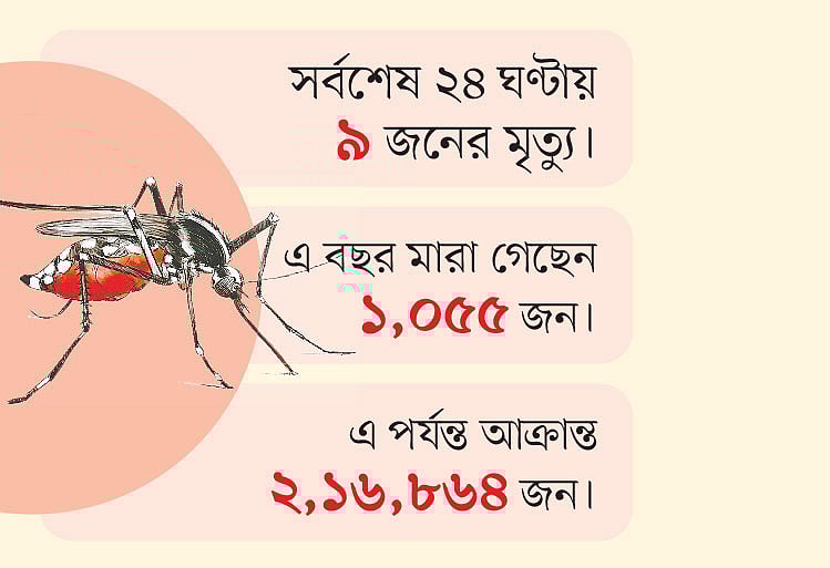 স্বাস্থ্য অধিদপ্তরের তথ্য অনুযায়ী, গত বুধবার সকাল ৮টা থেকে গতকাল বৃহস্পতিবার সকাল ৮টা পর্যন্ত ২৪ ঘণ্টায় দেশে ডেঙ্গু আক্রান্ত আরও ২ হাজার ৬১৭ জন রোগী হাসপাতালে ভর্তি হয়েছেন। এ সময়ে ডেঙ্গুতে আরও ৯ জনের মৃত্যু হয়েছে। এ নিয়ে চলতি বছরে ১ হাজার ৫৫ জনের মৃত্যু হলো।