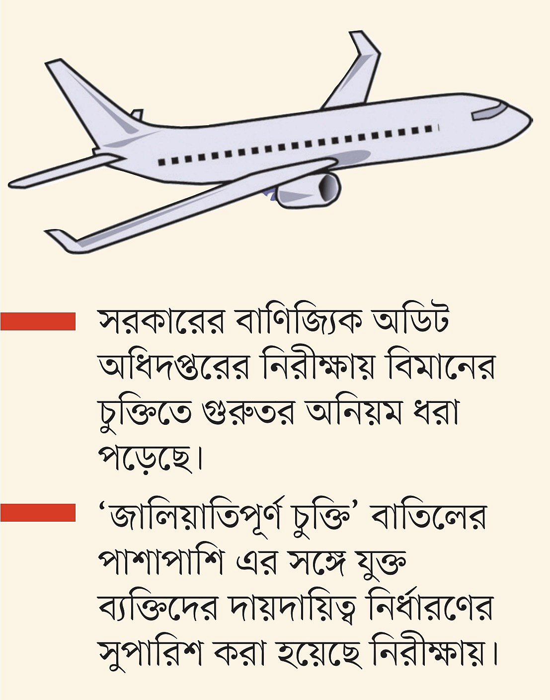এসব বিষয়ে বাণিজ্যিক অডিট অধিদপ্তরের নিরীক্ষাকালে বিমানের কাছে জবাব চাওয়া হয়। কিন্তু বিমান ‘জবাব প্রদান হতে বিরত রয়েছে’ বলে নিরীক্ষা প্রতিবেদনে উল্লেখ করা হয়। এতে নিরীক্ষার সুপারিশে বলা হয়, উচ্চপর্যায়ের তদন্ত কমিটির মাধ্যমে ক্রয় আইন ও বিধি লঙ্ঘন করে জালিয়াতিপূর্ণ চুক্তি সম্পাদনের বিষয়ে দায়দায়িত্ব নির্ধারণ এবং অবিলম্বে বিমানের স্বার্থপরিপন্থী উক্ত চুক্তি বাতিল করা আবশ্যক।