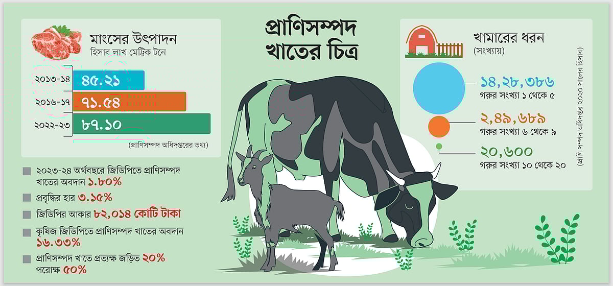 প্রাণিসম্পদ অধিদপ্তরের হিসাব অনুযায়ী, ২০২৩-২৪ অর্থবছরে জিডিপিতে স্থির মূল্যে প্রাণিসম্পদ খাতের অবদান ১ দশমিক ৮০ শতাংশ। এ খাতে প্রবৃদ্ধির হার ৩ দশমিক ১৫ শতাংশ। আর চলতি মূল্যে জিডিপির আকার ৮২ হাজার ১৪ কোটি টাকা।