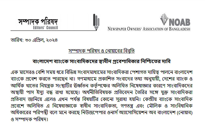 আজ মঙ্গলবার নোয়াব সভাপতি এ কে আজাদ ও সম্পাদক পরিষদ সভাপতি মাহ্ফুজ আনাম এক যৌথ বিবৃতিতে এ কথা বলেন। বিবৃতিতে বাংলাদেশ ব্যাংকে সাংবাদিকদের বাধাহীন প্রবেশ দ্রুততার সঙ্গে নিশ্চিতের দাবি জানানো হয়।