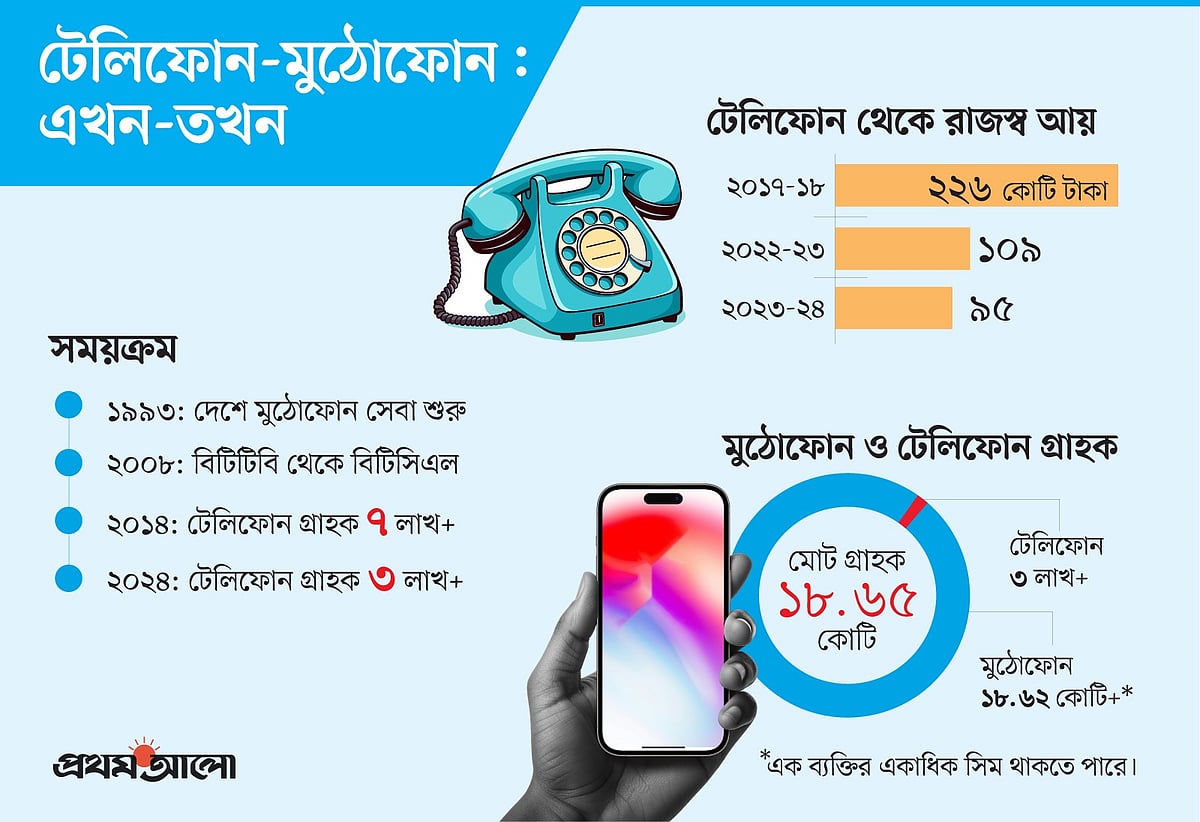 বিটিসিএল সূত্রে জানা যায়, ২০২৪ সাল পর্যন্ত দেশে টেলিফোনের গ্রাহক ছিল ৩ লাখের কিছু বেশি, ১০ বছর আগেও যা ছিল ৭ লাখের বেশি।