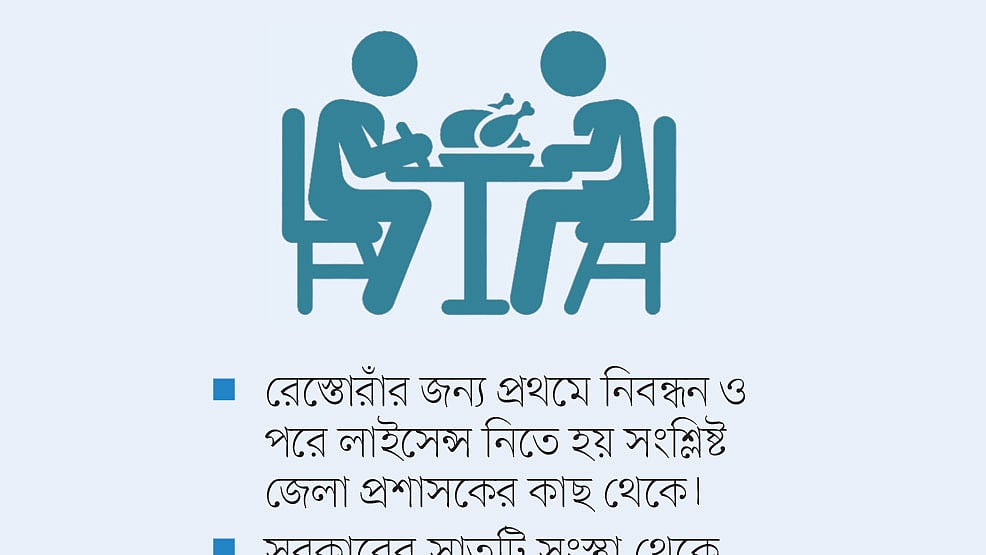 রেস্তোরাঁ ব্যবসা করতে চাইলে একজন বিনিয়োগকারীকে সরকারের সাতটি সংস্থার অনুমোদন ও ছাড়পত্র নিতে হয়। রেস্তোরাঁর জন্য প্রথমে নিবন্ধন ও পরে লাইসেন্স নিতে হয় সংশ্লিষ্ট জেলা প্রশাসকের কাছ থেকে। ঢাকা জেলা প্রশাসকের কার্যালয়ের তথ্য অনুযায়ী, সরকারের সব সংস্থার প্রয়োজনীয় অনুমোদন ও ছাড়পত্র নিয়ে ঢাকায় রেস্তোরাঁ ব্যবসা করছে মাত্র ১৩৪টি প্রতিষ্ঠান। এর মধ্যে রাজধানীর দুই সিটি করপোরেশন এলাকায় রয়েছে ১২৮টি রেস্তোরাঁ।